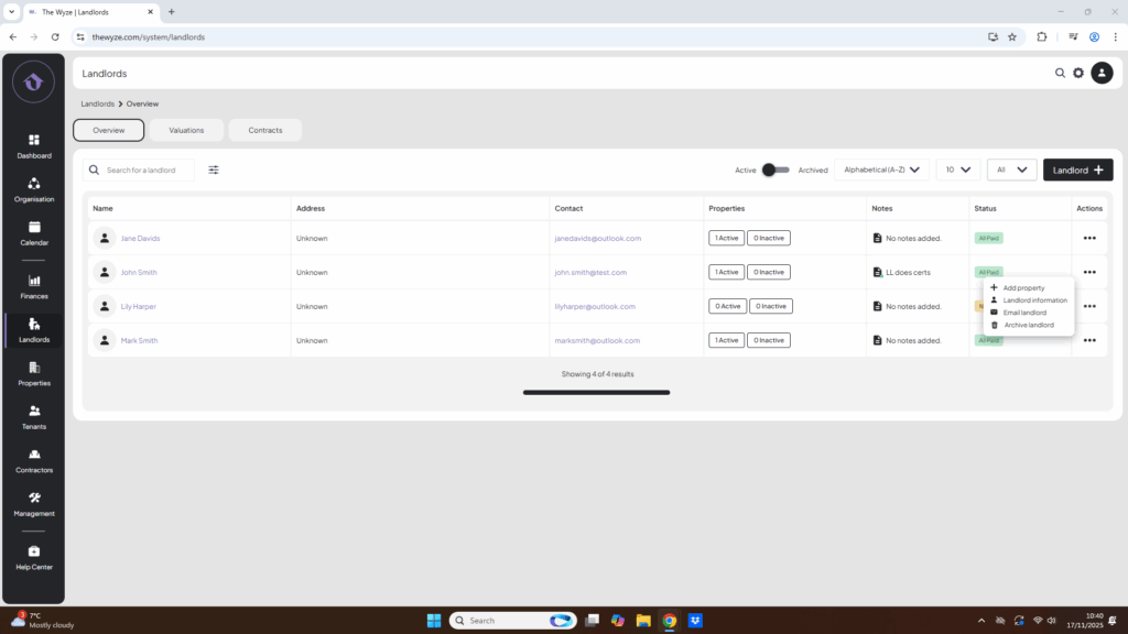 - As you add properties for the landlord, their status will change based on the properties associated with them.