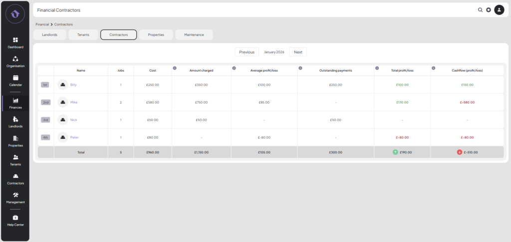 - Monitor outstanding rents, landlord deductions, and contractor payments.